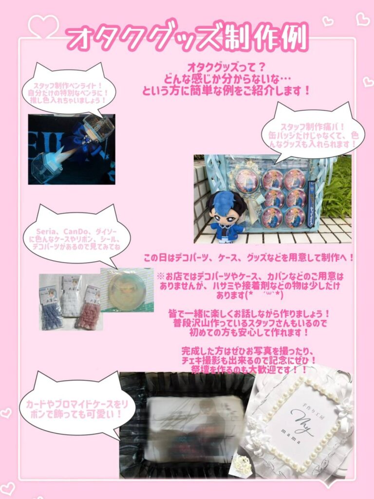 例)好きなキャラのグッズを持ってきてオタバ、ぬいバ、グッズまとめて飾るなど