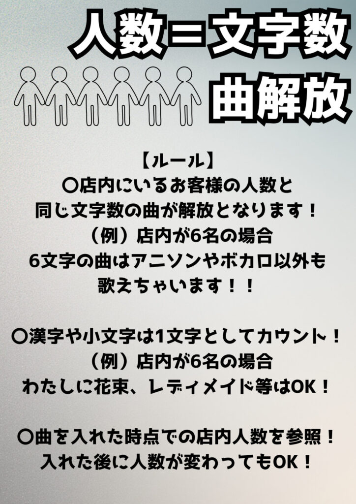 ・タイトル通り!「店内の人数=文字数」で曲開放!します!細かなルールは以下の通りです!要チェック!