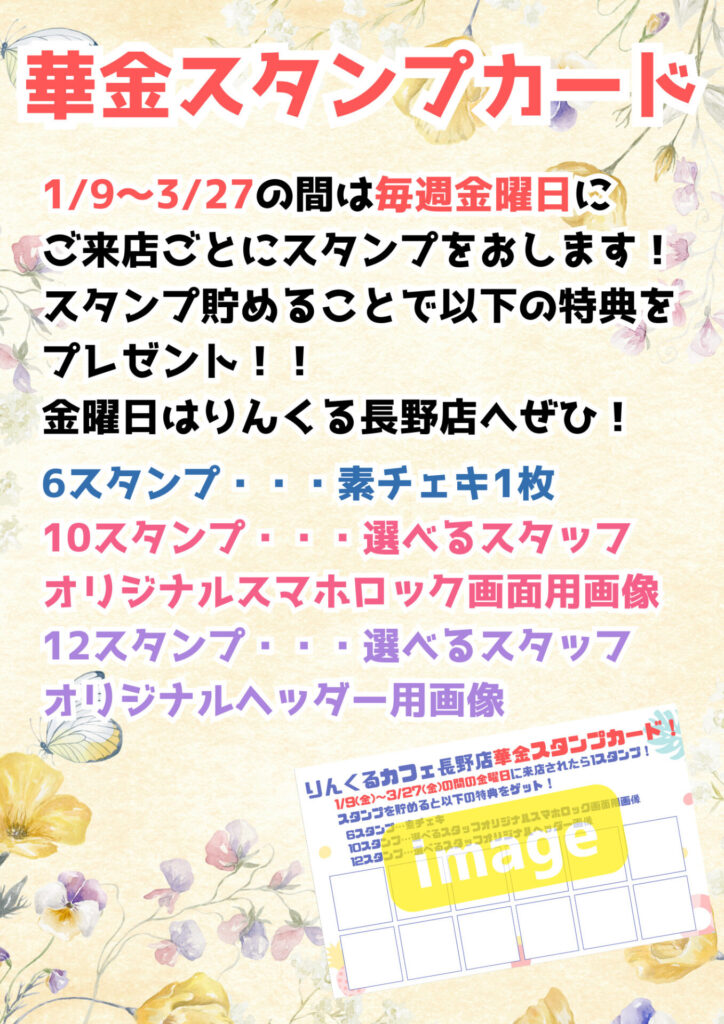 1/9〜3/27の金曜日はご来店ごとにスタンプゲット!集めたスタンプに応じてプレゼントもございます!