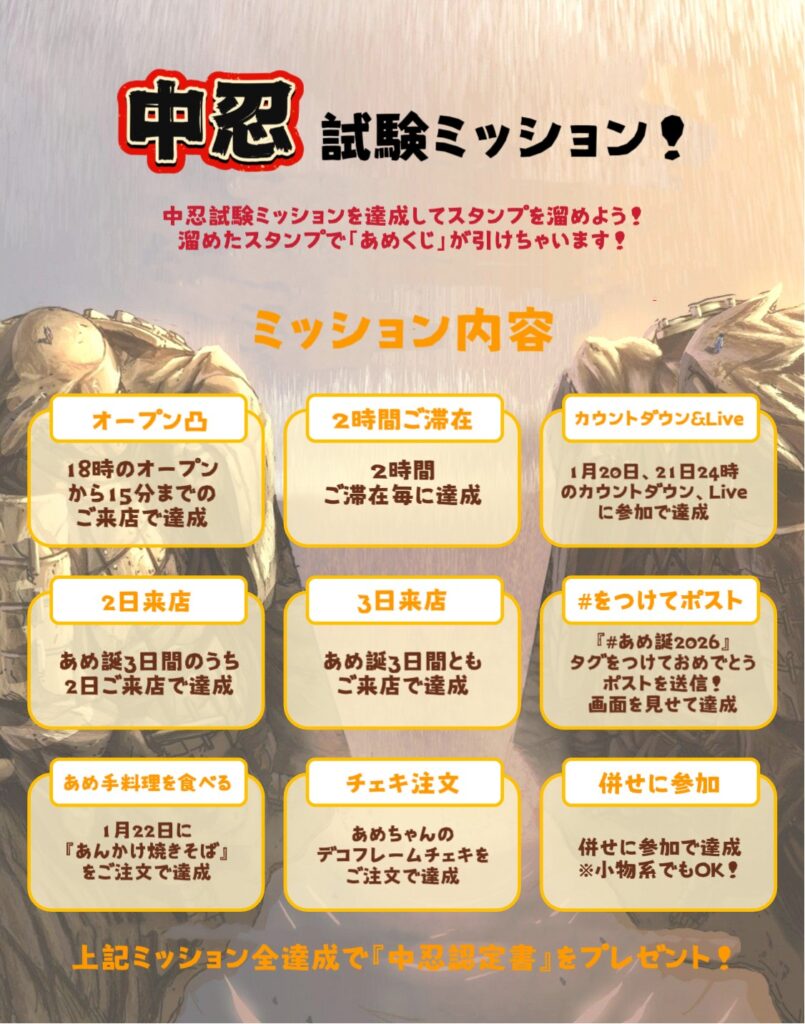 ご来店いただいた皆様にはあめちゃん試験管が出題する中忍試験を受けて頂きます!