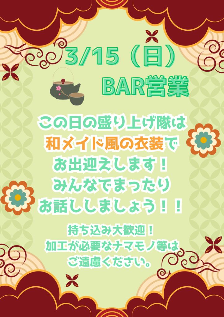 ■15日(日):BAR営業🍷和メイド併せ🍵