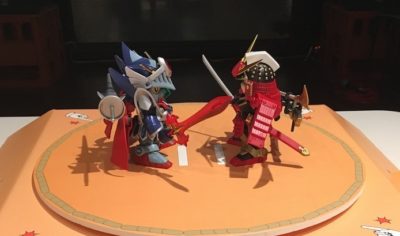 お客様が作ったSDガンダムプラモを持ち寄って、それを力士として紙の土俵の上でとんとん相撲で勝敗を決する大会です!