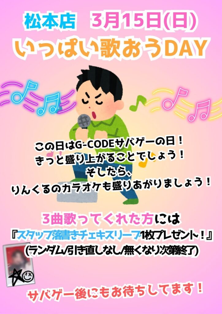 3曲歌ってくれた方には『スタッフ落書きチェキスリーブ1枚プレゼント!』(ランダム/引き直しなし/無くなり次第終了)