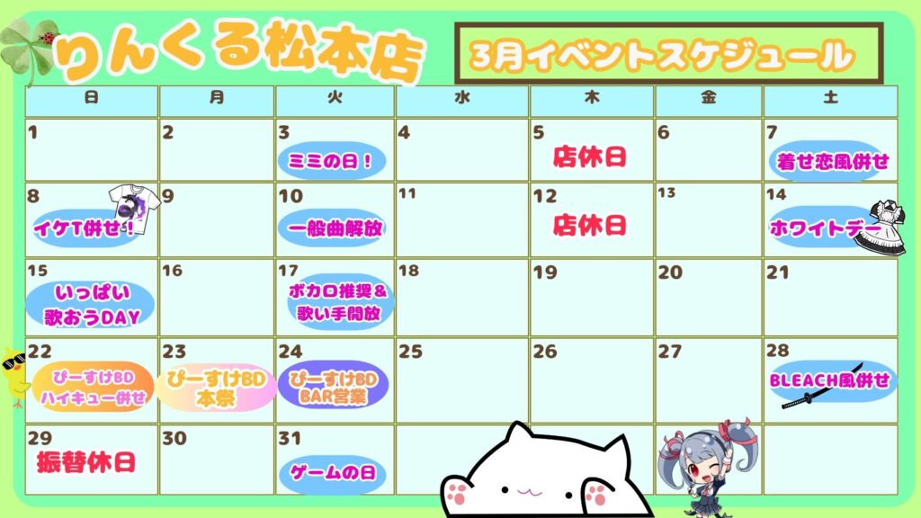 3月!いよいよ春が近づいてきました!3月は併せイベントの他にホワイトデーイベントやぴーすけちゃんBIRTHDAYイベントがありますよ!沢山盛り上がりましょう!