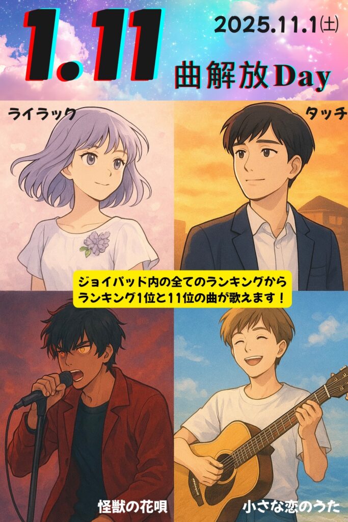 ・ジョイパッドの各ランキングやあの頃の曲などの1位と11位に入っている曲はなんでも歌ってOKの日です!